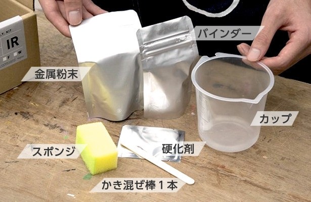②金属粉末とバインダーを付属のカップに入れ、かき混ぜ棒で混ぜ合わせます。