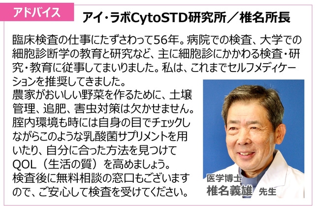 【検査内容】粘膜細胞組織を子宮から採取し、善玉乳酸菌の有無、悪玉菌(膣ガルドネラ菌)の有無、カンジダ菌の有無を検査します