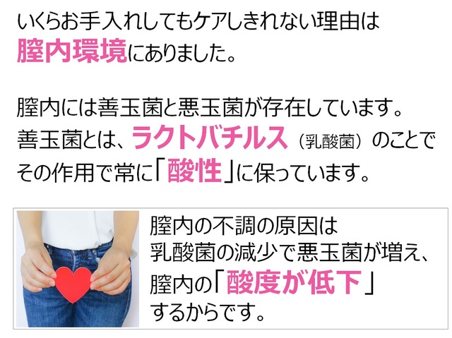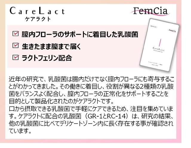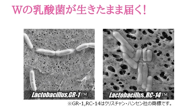 本品には乳酸菌GR-1(Lactobacillus rhamnosus)および乳酸菌RC-14(Lactobacillus reuteri)が含まれます。乳酸菌GR-1および乳酸菌RC-14には、膣内環境を良好にし、膣内の調子を整える機能が報告されています。