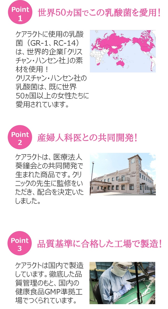 - 10億個以上の乳酸菌(GR-1、RC-14)で膣内環境を整える!機能性表示食品届出済み!