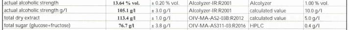 分析結果のスクリーンショットです。アルコール度数(actual alcoholic strength)が13.64%、残糖度(total sugar)が76.7グラムとなっています。