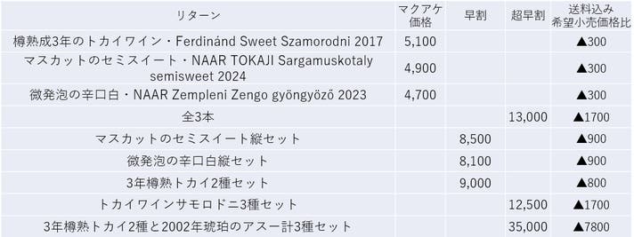 また、特別に2002年ヴィンテージの琥珀色のトカイアスー(写真右端)をセットに入れたリターンも作っています。このトカイアスーは弊社の旗艦商品です。割安な価格設定にしておりますので、トカイワイン好き、貴腐ワイン好きの方はぜひお試しください。