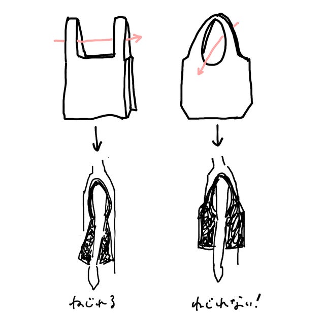 多くの折り畳めるバッグは取っ手が脇から続いているレジ袋と同じ構造をしています。手に持つには良い作りですが、図のように肩にかけると捩れが発生します。Minimalism Tote-Bagでは肩にかけて使用する場面も考慮して、フラットに使用できる構造にしました。