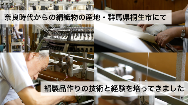 はじめまして、群馬県桐生市で絹製品の生産を手掛けている、株式会社テキスタイル昌と申します。桐生市の絹製品の起源は奈良時代まで遡り、日本を代表する絹製品の生産地として、1000年を超える歴史と伝統を紡いでおり、私たちもその歴史と伝統を受け継いで、様々な絹製品の製造に取り組んでまいりました。
