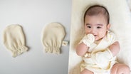 赤ちゃんの小さなおててを優しく包む手袋です。お顔をひっかいてしまったり、おしゃぶりで手が荒れてしまうのを防ぐといった効果があります。
