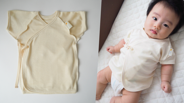 赤ちゃんのお腹から腰あたりまでの丈で作られた肌着です。袖は半袖で、前を合わせて紐で結ぶ形となっています。赤ちゃんの素肌に直接触れる短肌着には、汗をかきやすい赤ちゃんの汗取りや体温調節といった役割が求められ、kinuがその効果を発揮します。また母乳やミルクの吐き戻しにより1日に何度も着替えることがあるため、複数枚のパッケージもご用意しました。