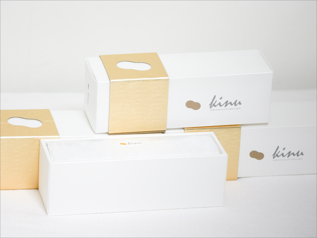 シルクのごとき純白の箱、繭を形どった黄金の留め具、kinuの世界観を伝えられるように包装にもこだわり抜きました。受け取った瞬間に伝わる品の良さは、新しく赤ちゃんを迎えるご家族・ご友人・ご同僚への贈り物として最適です(短肌着1枚・2枚セットは別の包装となります)。