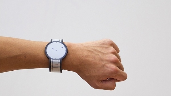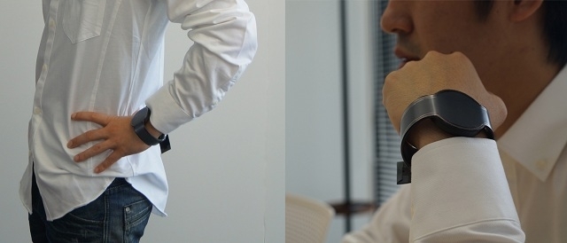 時計を見る動作をすると、文字盤とベルトの柄が変わって時刻が浮かび上がります。