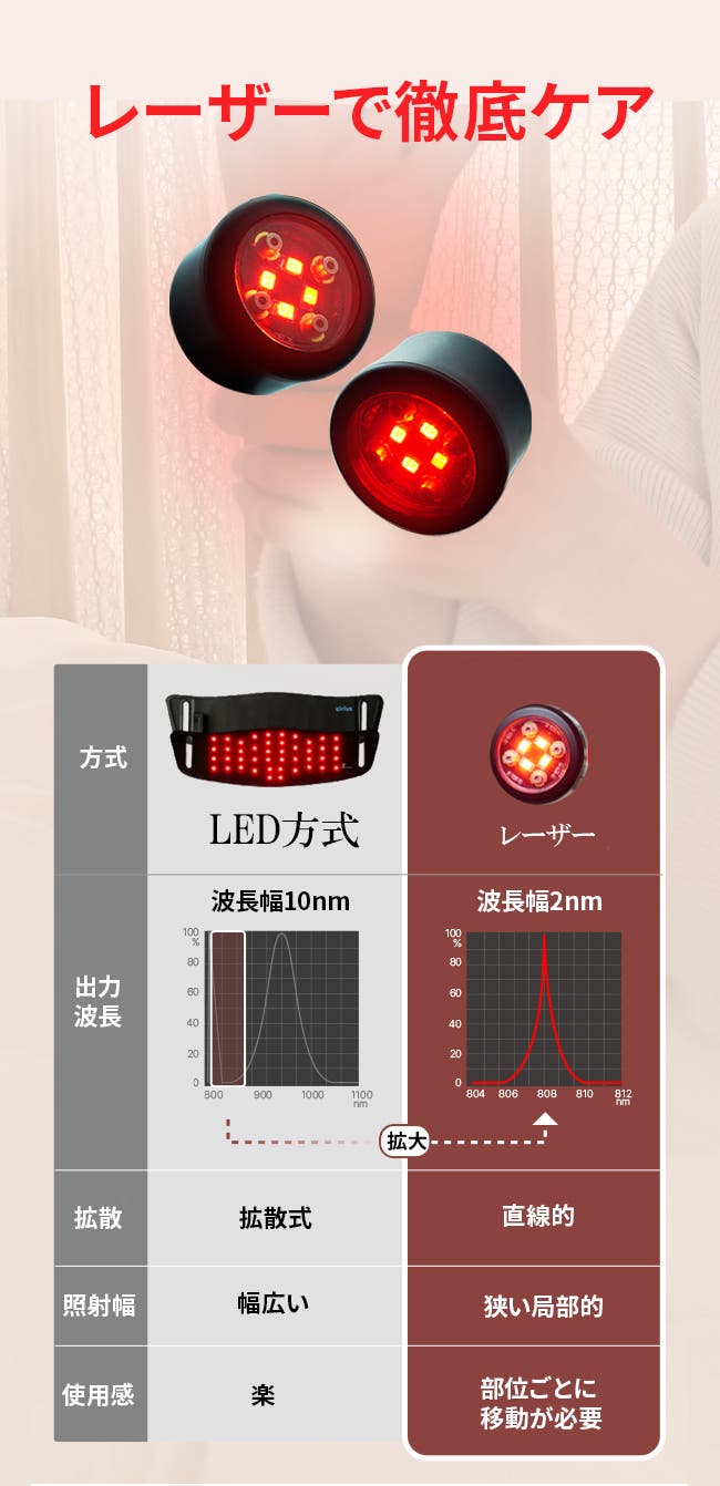 レーザー方式は狭い範囲に限定された光であるため、気になる局部に当てる必要があるが、集約された光線でケアができます。