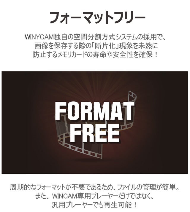- WINYCAMドライブレコーダーは、専用プレーヤーはもちろん、汎用プレーヤーで も再生可能となっております。但し、1/2CH同時送出や設定値の変更などの機能については、WINYCAM専用プレーヤーでしかご使用できませんので、何卒ご了承ください。