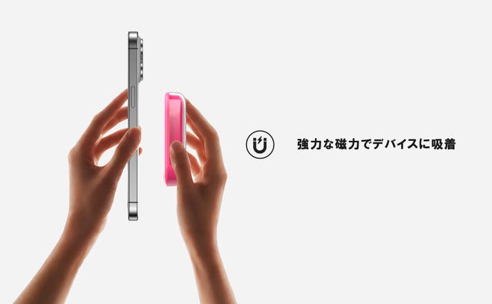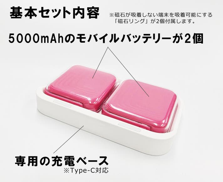 A.附属している「磁石リング」を端末に装着する事で、モバイルバッテリーが吸着するようになります。