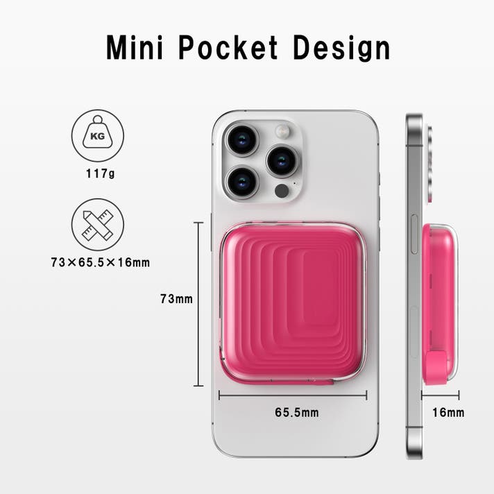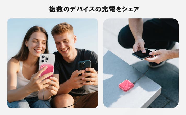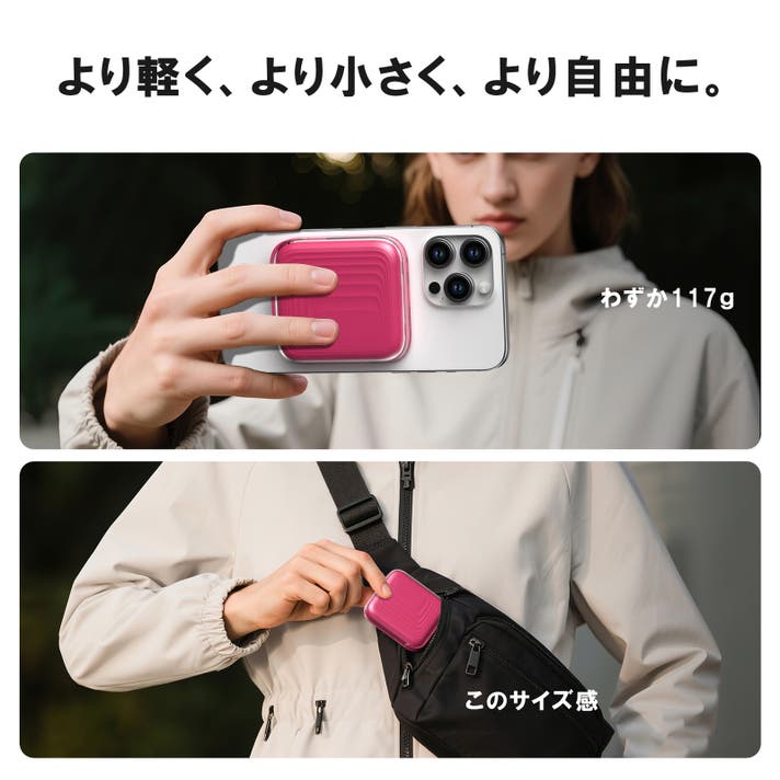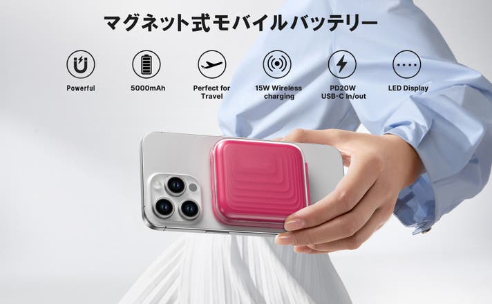 - 小型、5000mAhの容量、マグネット吸着、ワイヤレス充電
