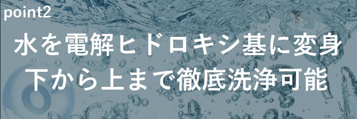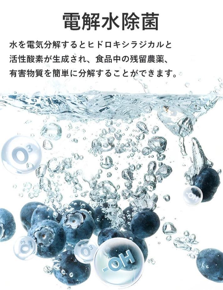 水をヒドロキシ基(–OH)を電解で生成し、野菜・果物・食材の表面の汚れだけでなく、有機物を酸化分解、洗浄後に水と二酸化炭素に戻ります。