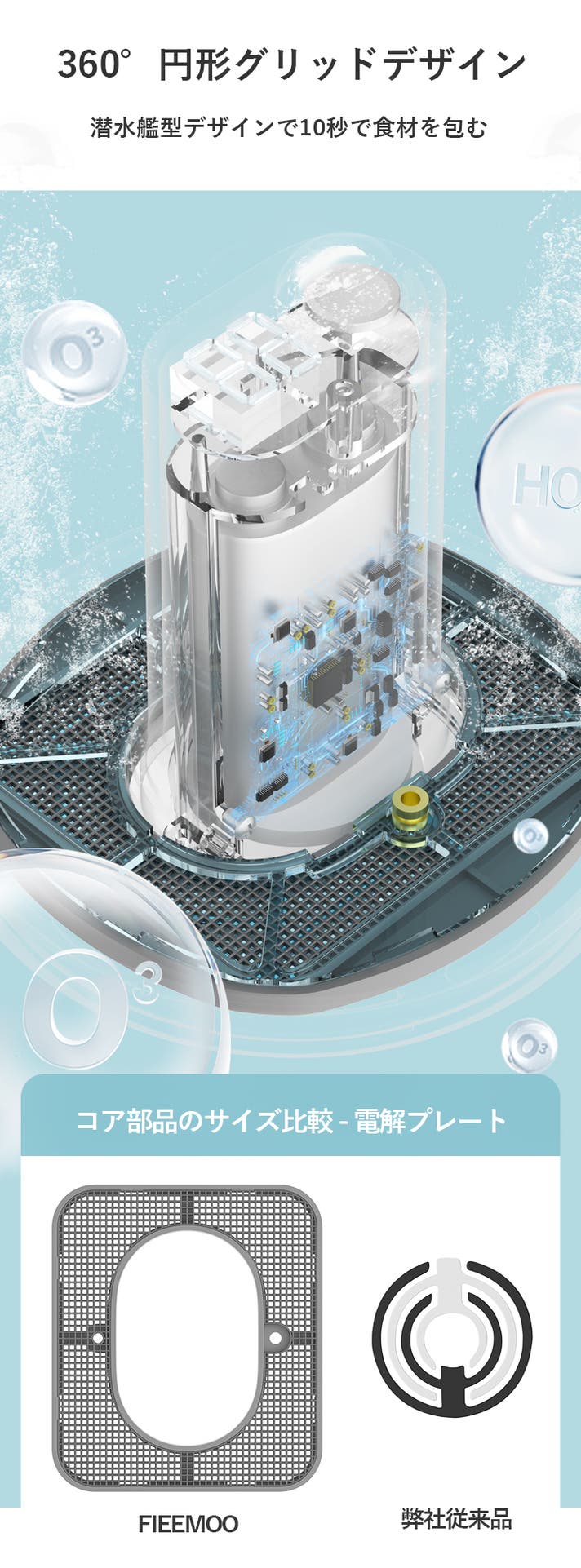 「FIEEMOO」は水道水だけで野菜・果物を洗浄できるマシンで、電極で水を電気分解し、水酸化物イオン(OH−)を作って、野菜・果物表面の残留農薬や化学物質を有効的に除去することができます。