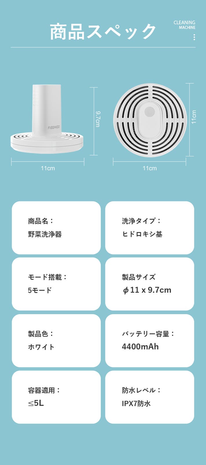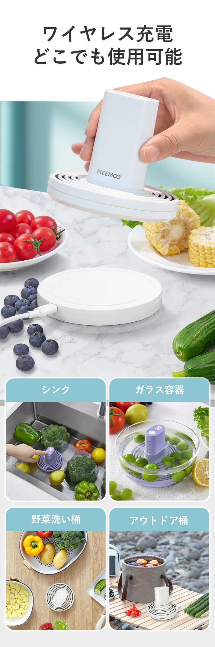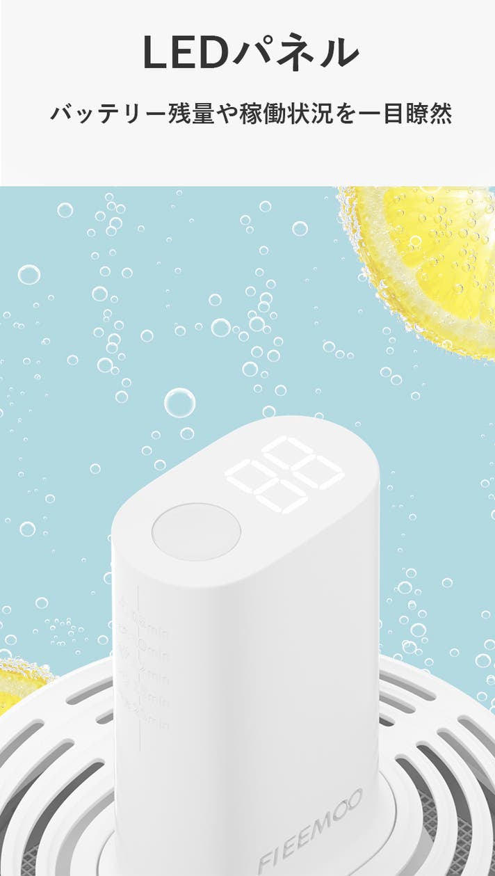 「FIEEMOO」はワイヤレス充電式で、充電パットにかざすだけで充電可能。コード無しのおかげでどんな容器でもすぐに洗浄可能になります。IPX7防水認証が取れており、浸水の恐れがありません。