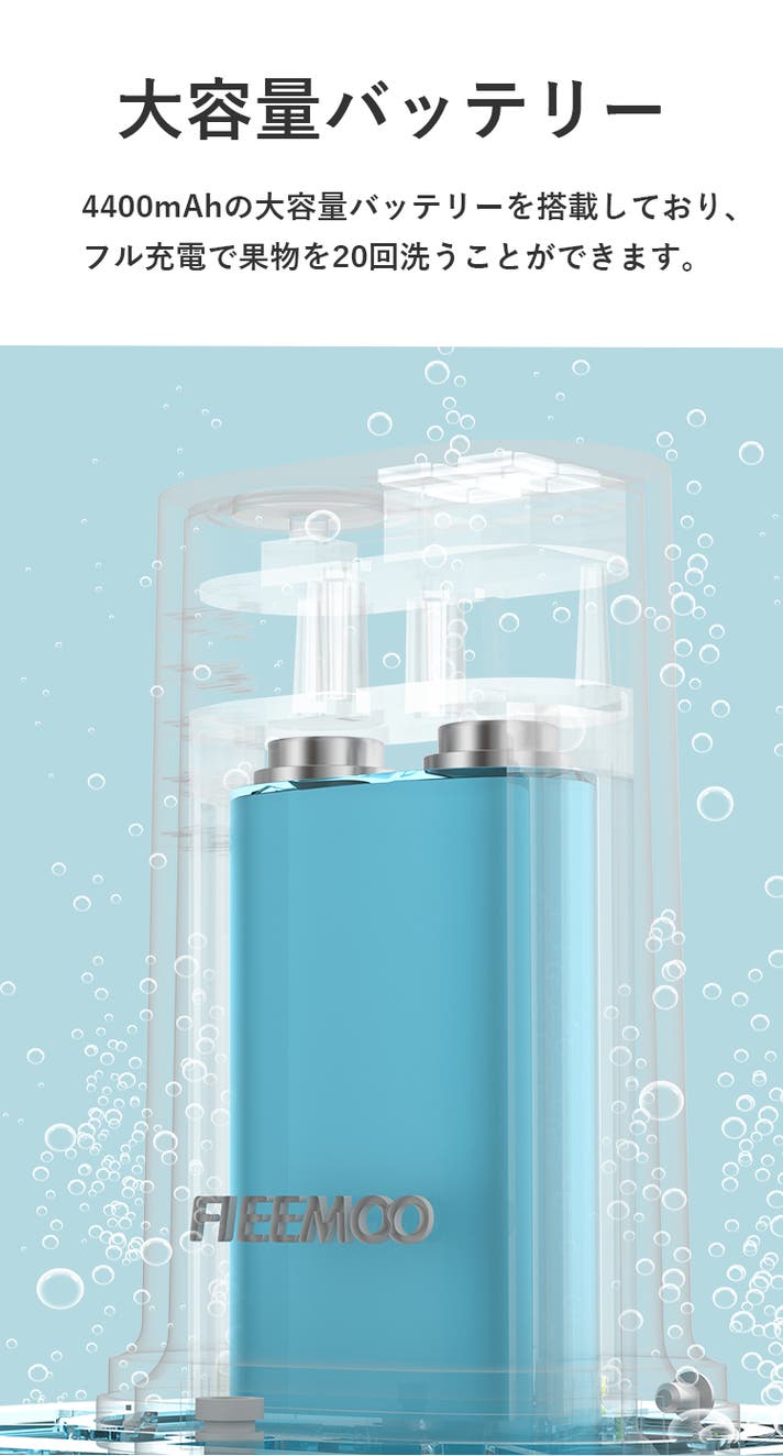 「FIEEMOO」は水道水だけで野菜・果物を洗浄できて、場所を取らずに水さえあれば洗浄可能になります。洗剤を使わずの洗浄により、洗剤の残留リスク、皮膚や目への刺激、栄養・風味の損失などを有効的に避けることができます。