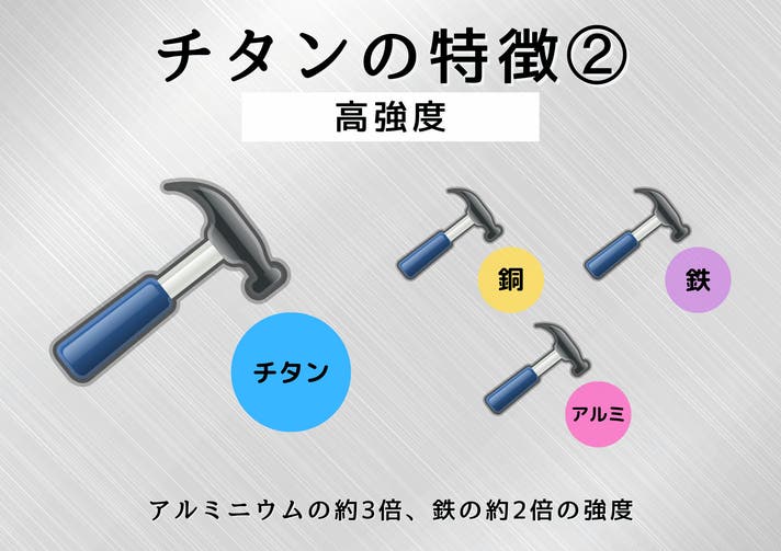 チタンは高強度の金属としても知られています。その強度はアルミニウムの約3倍。鉄の約2倍とされています。