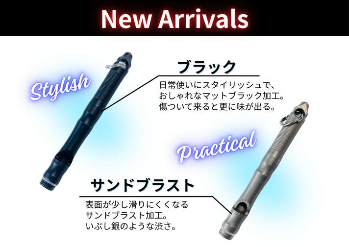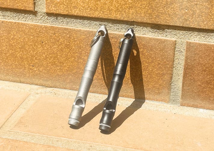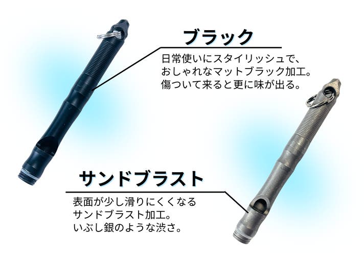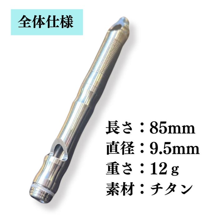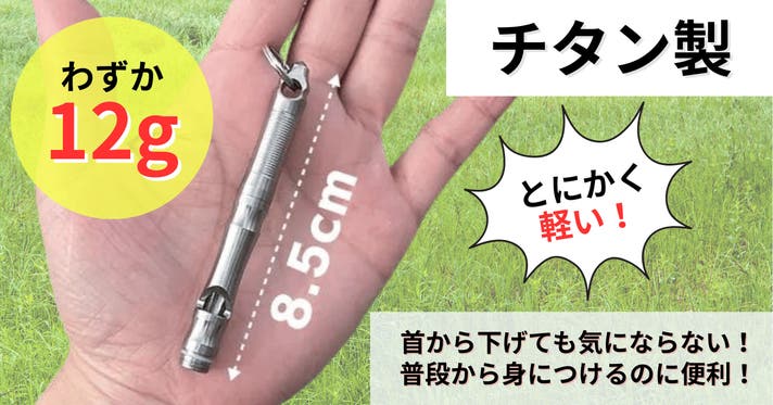 万が一の時に、錆びてしまったり、変形してしまっては意味がありません。普段スポーツなど使うだけなら、プラスチックでもいいでしょう。しかし、防災笛は命綱。万が一に備えた丈夫さと、とにかく軽量であることにこだわり、あえて高級素材のチタンを採用いたしました。