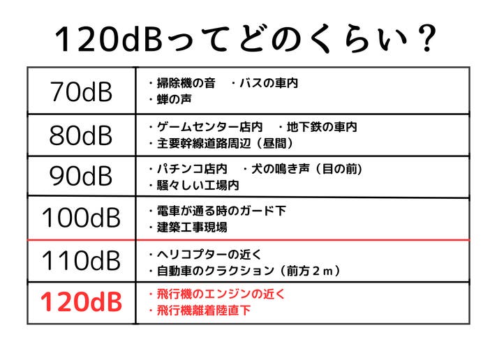 ※参考:飛行機の離着陸、エンジンの近くの音量が120dB程度です。