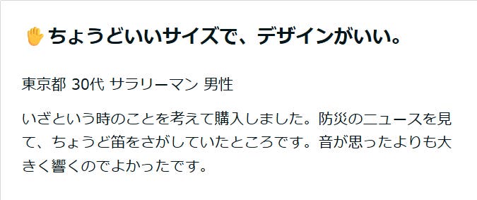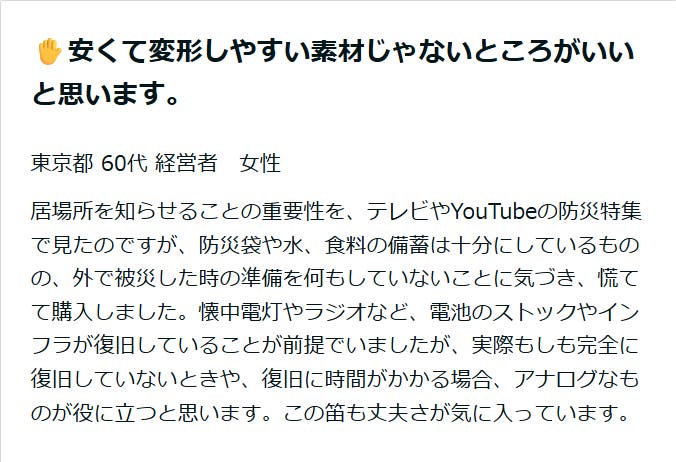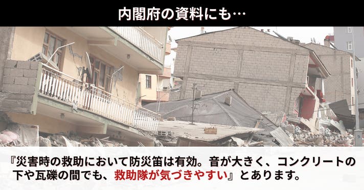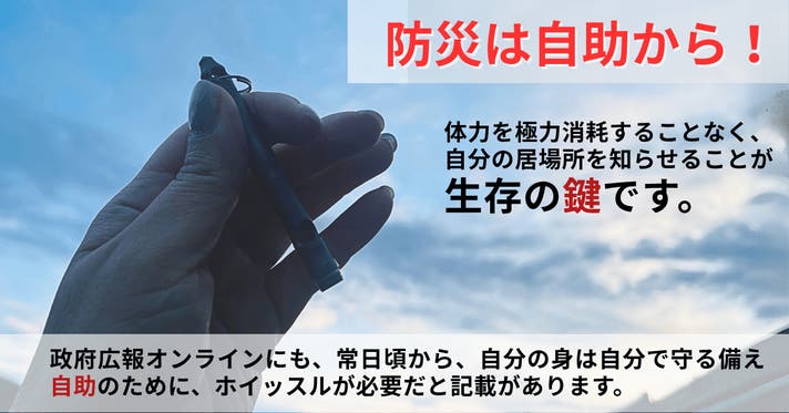 首相官邸HPにも、『助けを求めるために、電池式のブザーなどは、いざという時に電池がないと作動しなかったりするおそれもあり、笛が対策グッズに適している。』と記載されています。