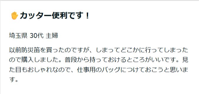 …など、防災笛としてだけでなくご利用いただける機能性を備えることで、多くの方に幅広くご利用いただいております。