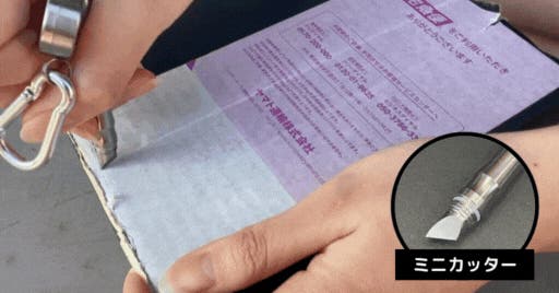 リバーシブルで収納されているミニカッターは、ダンボールを開けたりするのに役に立ちます。開発者が災害ボランティアに参加した際、災害支援物資の荷分けをする時に刃物が足りずに困った経験から、簡易的なカッターを普段から持ち歩きたいという想いを実装しました。