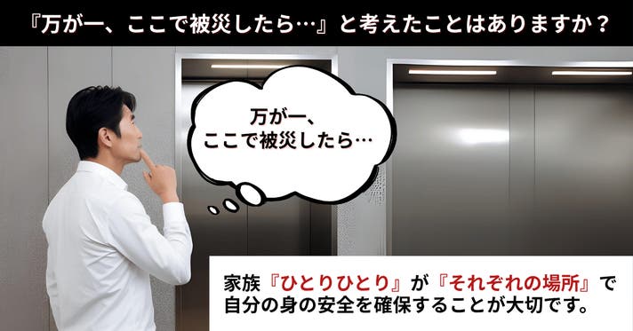 出先のトイレ、取引先に向かう車の中、雑居ビルの窓のないシェアオフィス、たまたま乗った古いエレベーターの中…自宅や会社、学校など、誰かと一緒にいる時よりも、誰かに自分の居場所を告げずに行った先で【ひとりで被災する可能性】の方が、確立的にはるかに高いのです。