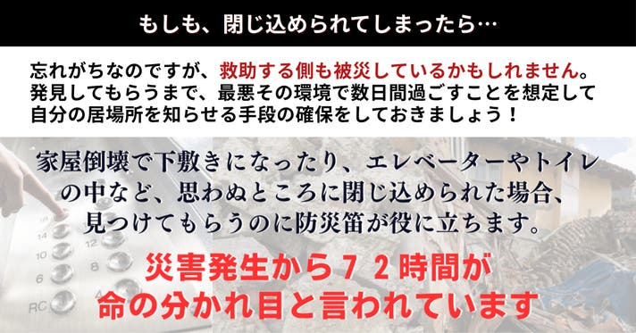 まずは防災の観点から、なぜ防災笛(特にFINDME)が必要なのかについてご説明させていただきます。皆様も普段から災害備蓄など、意識高く準備されていることと思いますが、ぜひ今一度振り返っていただきたいことがあるのです。