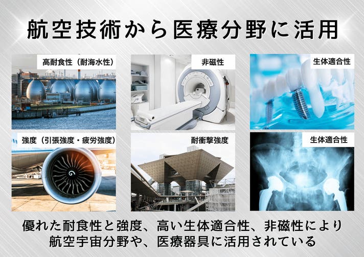 チタンは、腐食しづらく、強度が高く、耐衝撃性に優れ、生体適合性が高いという特徴から体内インプラントにも使われるなど、幅広い分野で採用されている金属です。