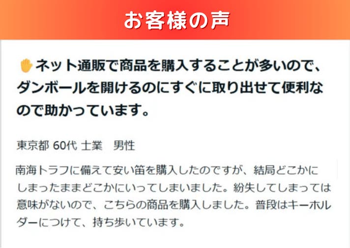 防災笛の重要性がお判りいただけたところで、どんなものを選べばいいのか問題があります。『南海トラフ警報が出た際に、防災笛を買った!』というお声を聴くことがありますが、その笛、今現在、普段から持ち歩いていますか?どこかにしまったままになっていませんか??