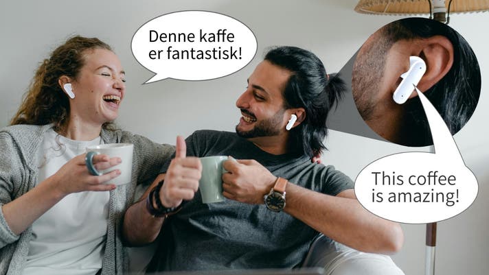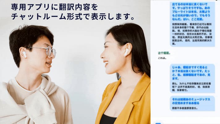 愛用のスマホに専用アプリをダウンロードして同期し、アプリの「デュアルイヤホンモード」を選択して自分と相手の耳に片方ずつイヤホンを装着すると、リアルタイムで双方の言語を音声で翻訳します。