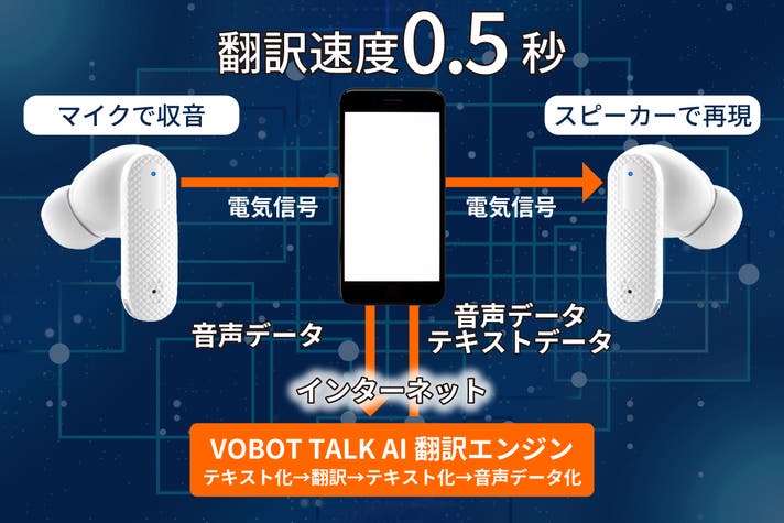 話者の言葉をイヤホンのマイクが拾い、専用のスマホアプリを通じてインターネット上のAI翻訳エンジン「VOBOT TALK」で聞き手の言語に翻訳。その結果を聞き手のイヤホンのスピーカーに音声で届けます。