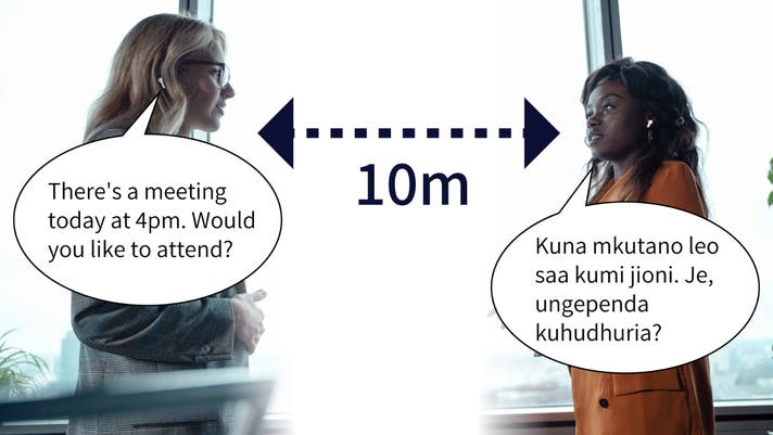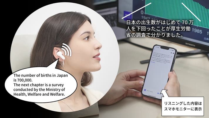装着したイヤホンのマイクが対面の音声を拾い翻訳し、イヤホンのスピーカーに翻訳結果を音声で伝達します。人はもちろん、外国語のTVやラジオ、動画視聴、映画も音声で翻訳します。