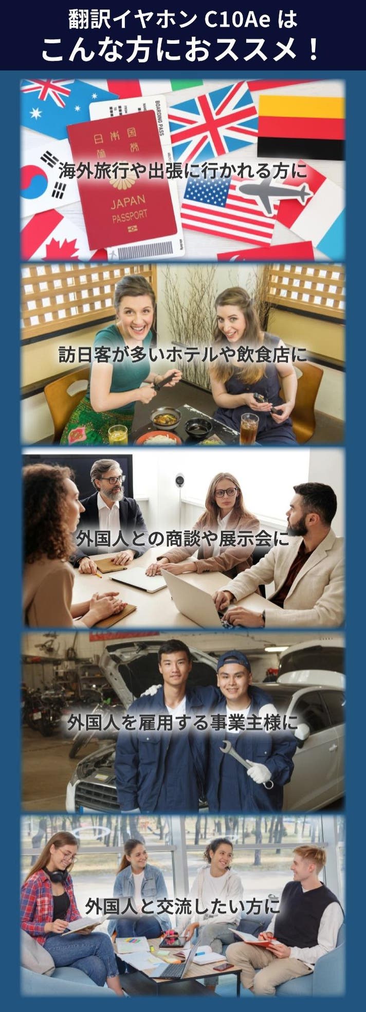 今回のC10Aeは弊社では初となる翻訳イヤホンです。長年Bluetooth搭載の音響機器開発を行ってきた強みを生かし、翻訳だけではなく音質や通信速度もこだわって開発しました。C10Aeが言葉の壁を越え、海外の人々とのコミュニケーションの一助となることを、心より願っています。