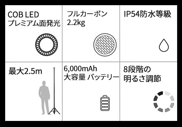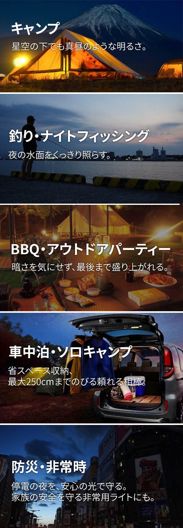 N7カーボンスタンドは折りたたみ時わずか70cm、最大250cmまで延長可能。高所から光を照射できるため、サイト全体を明るく照らし、設置も誰でも簡単に行えます。