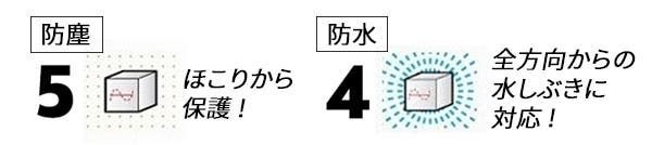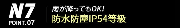 防水防塵:IP54等級(防塵5級:粉塵保護、防水4級:全方向の水しぶき保護)
