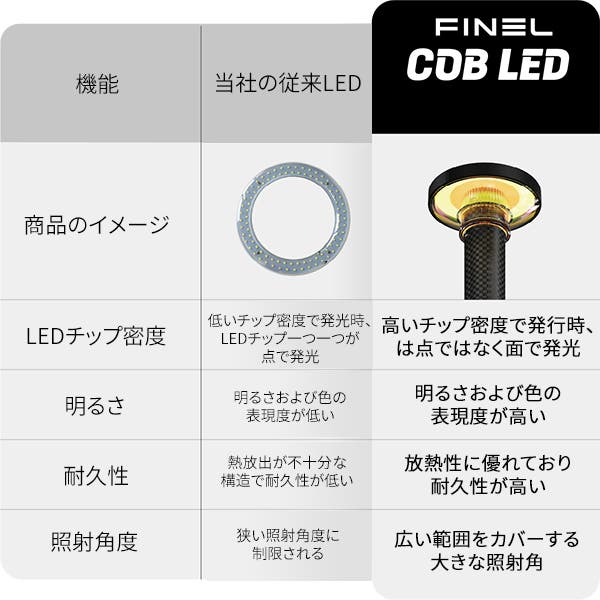 LEDチップの種類によって、明るさ・色表現・発熱・照射角は大きく変わります。テレビがLED→OLED→Micro LEDへと進化し、画質や色再現性が飛躍的に向上したのと同じように、私たちは低価格型LEDではなく、均一に光を届ける「面発光COB LED」を採用しました。