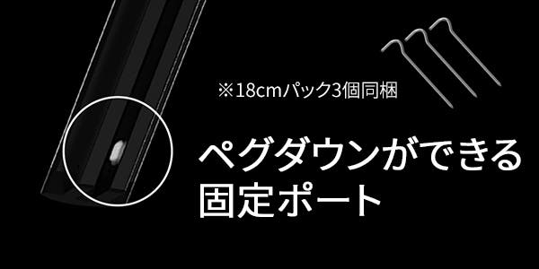 さらに先端にはラバーを装着し、支える力を高めているため、風でも簡単には倒れません。それでも不安な場合には、脚部を直接ペグダウン固定できる仕様。強風時でも安心してお使いいただけます。