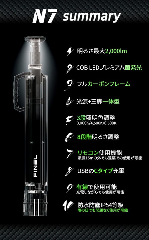 私たち FINEL は、日々の暮らしをより快適に、そして心に残る特別な体験へと導く製品づくりを目指しています。今回の FINEL N7 カーボンスタンドランタン は、アウトドアの夜をこれまで以上に快適にするために誕生しました。軽量性・耐久性・高輝度をすべて兼ね備えたフルカーボン仕様で、持ち運びやすさと安心感を両立しています。「ありそうでなかった」革新的なランタンを通じて、自然の中で過ごす時間をもっと楽しく、もっと自由にすること。それこそが、私たち FINEL の使命です。