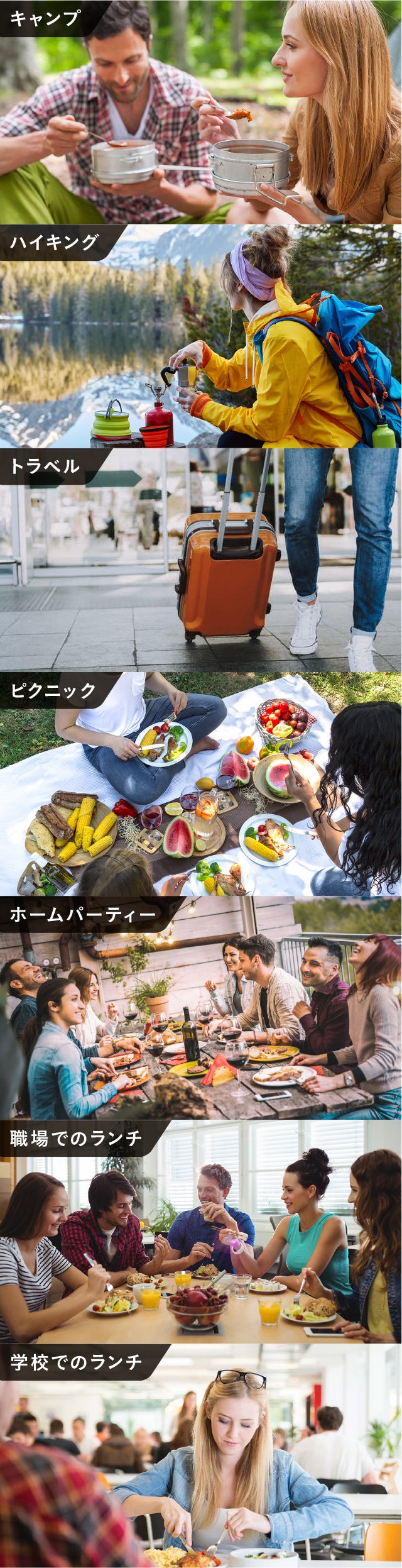 私たちの製品の特徴として、旅行、ピクニック、オフィスなどに持ち運びしやすいこと、そして、ほとんどの製品がキャンプやハイキング、トレッキングに使用できることです。