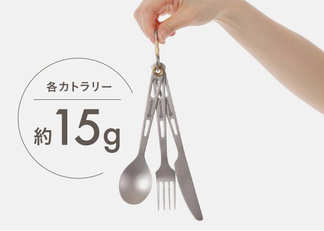 そのためチタンカトラリーなら各カトラリー約15g、3つの総重量でもわずか45g。圧倒的に軽いので、持ち運びも楽ですよ!