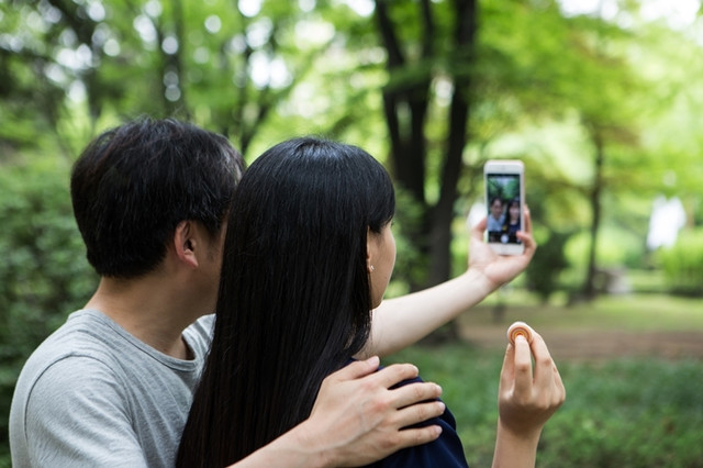 このようなツーショットでもスマートフォンの画面にあるボタンを気にせずに、手を伸ばして写真が取れます。画面のタッチではなく、ボタンを押して写真を撮るのも一つの楽しみでしょう。