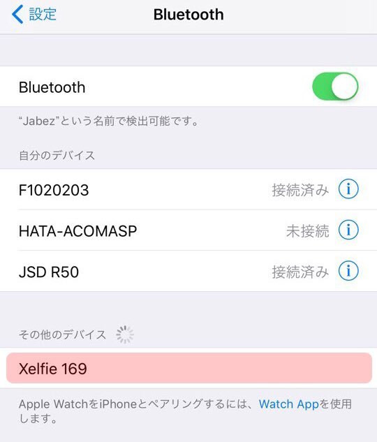スマートフォンの設定に入り、bluetoothをオンにします。フィンガボールのシャッターを押したら次のようにXelfiexxxが検索されます。それを押したらペアリングが出来ます。
