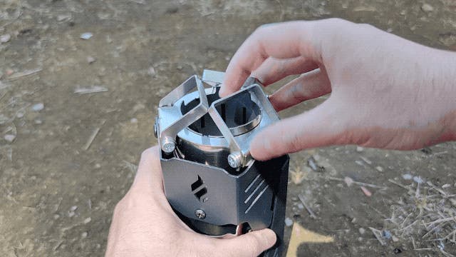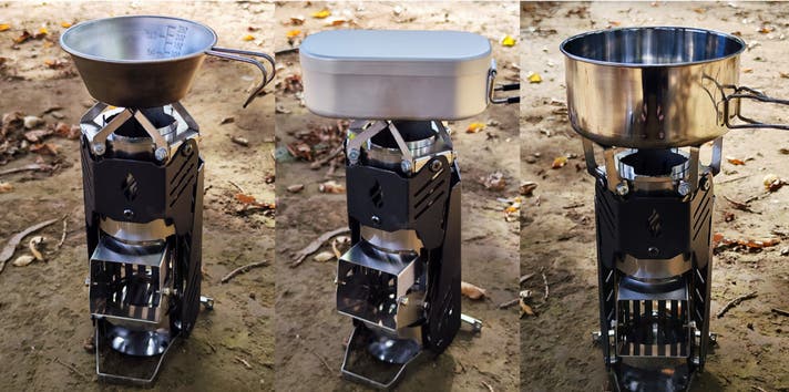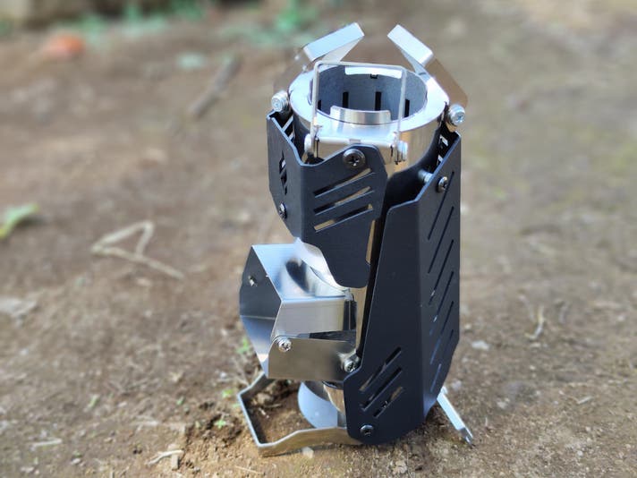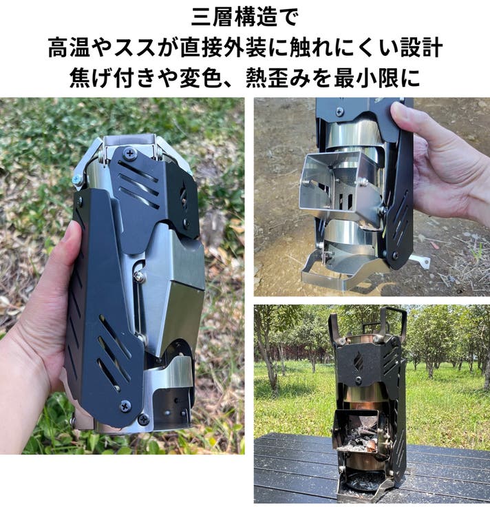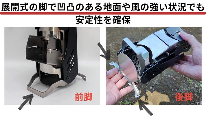 三本の脚を大きく拡げて設置できるこのロケットストーブは、接地面をしっかり確保して重心を低く保ち、風の強い環境や凹凸のある地面でもグラつきを最小限に抑えます。