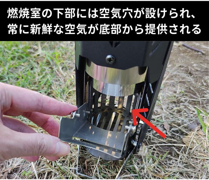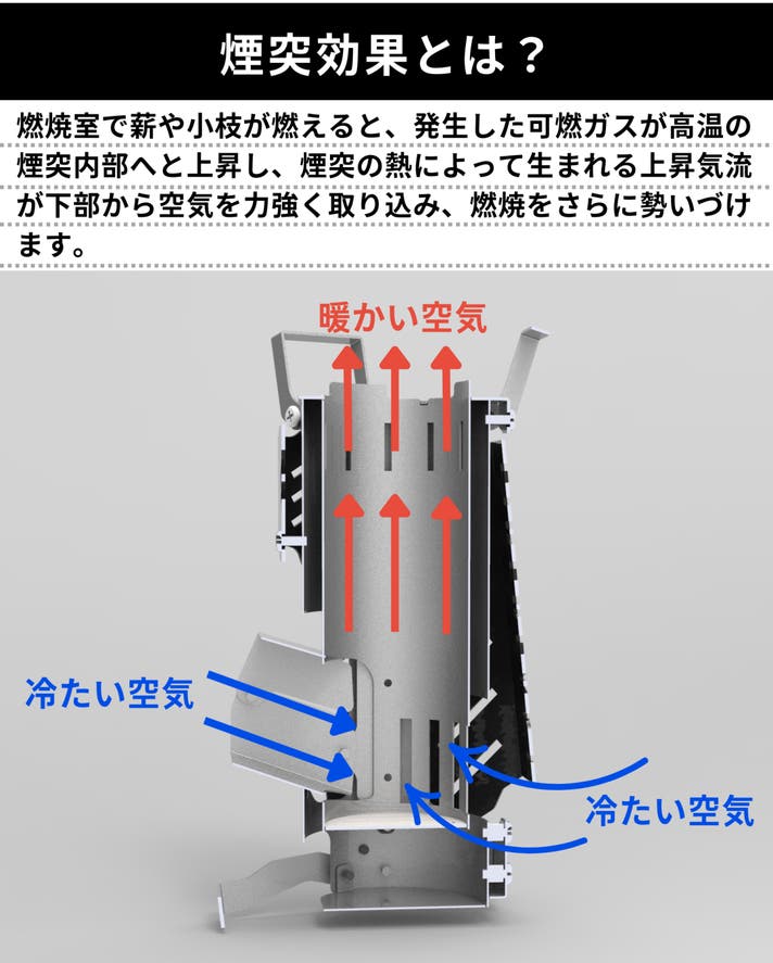 これにより、燃焼スペースには常に新鮮な空気が入り、燃料が切れるまで高火力を維持します。