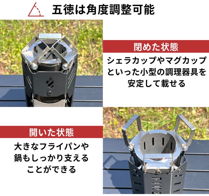シェラカップやマグカップなどの小型調理器具も安定して載せられる、角度調整可能な五徳設計へと進化しました。