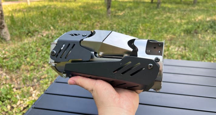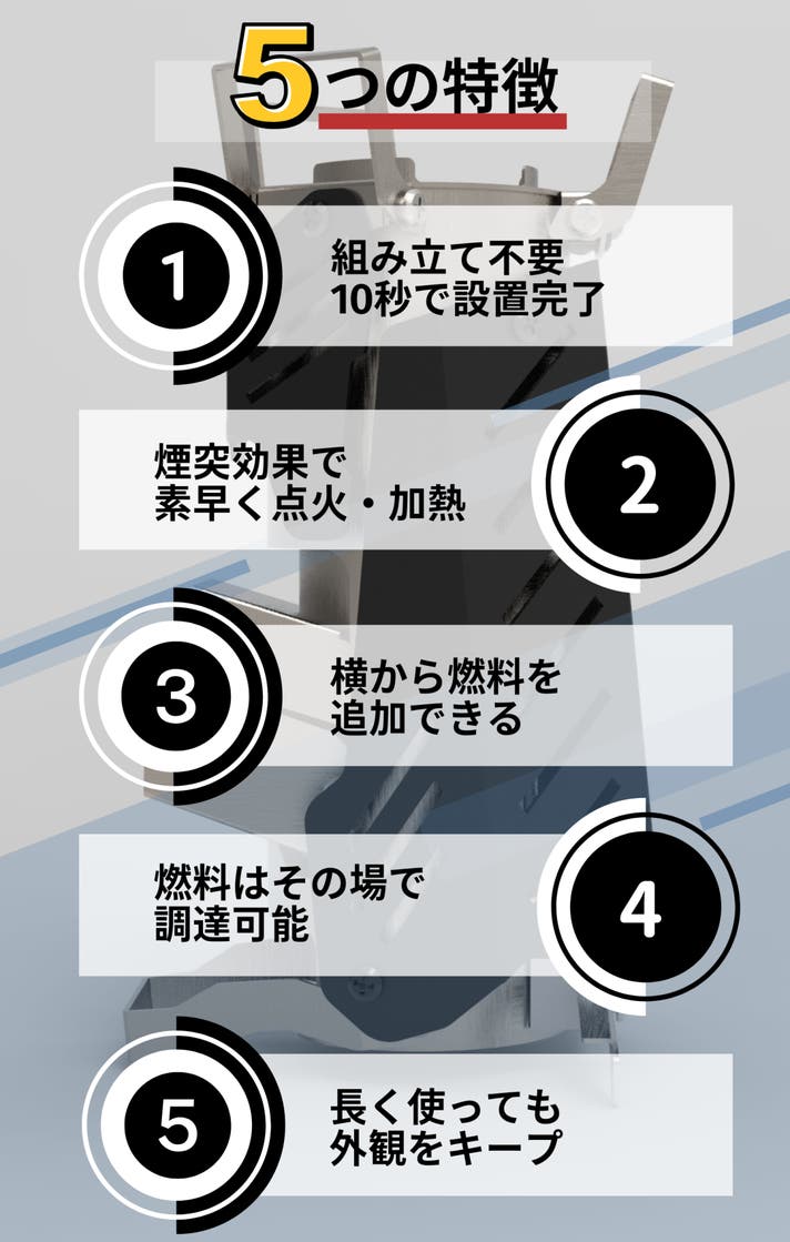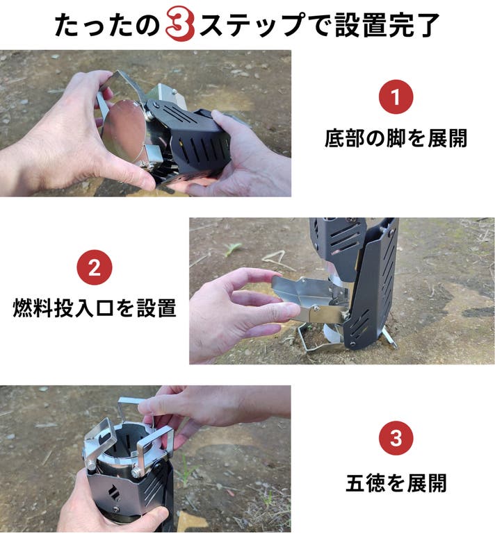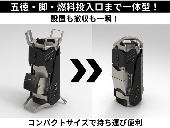 A:一体型で組み立てが不要な構造になっております。「10秒」で脚や五徳、燃料投入口を展開して設置できます。コンパクトサイズで、持ち運びも便利です。