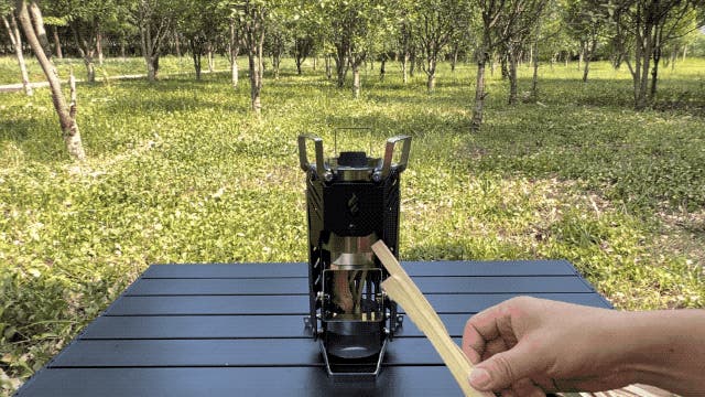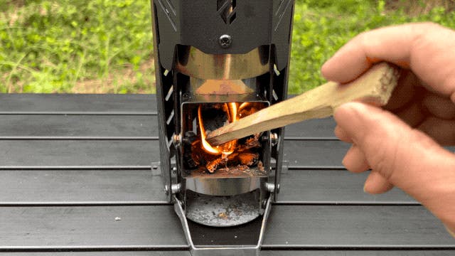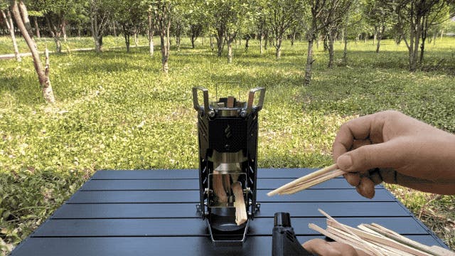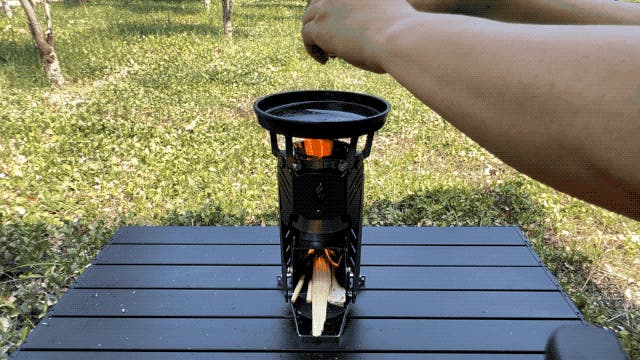 A:乾いた小枝、落ち葉、松ぼっくり、割り箸など現地調達しやすい燃料に対応します。薪やガス缶の携行量を抑えたい場合にも便利です。