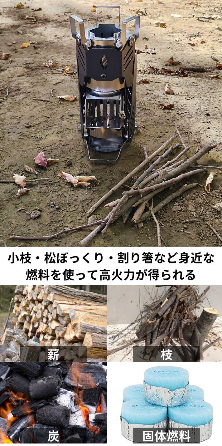 木くずや乾いた薪はもちろん、落ち葉や小枝など、身のまわりで手に入る燃料でもしっかりと燃焼し、アウトドアの時間をより豊かにしてくれます。