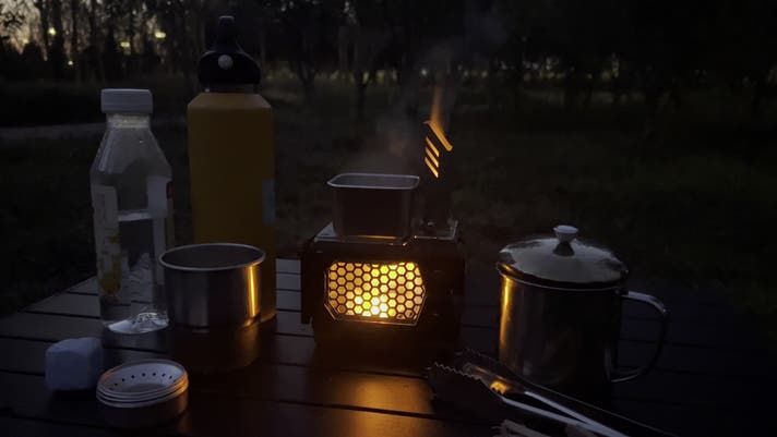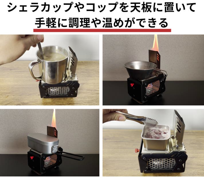A:天板にシェラカップや小型クッカーを置いて、お湯を沸かしたり、簡単な煮込みや温め料理などの軽調理にお使いいただけます。本格的な大人数分の料理というより、ソロ〜少人数向けの調理に適しています。